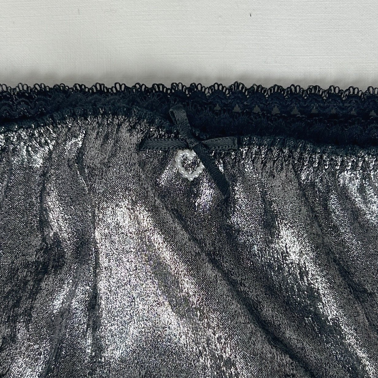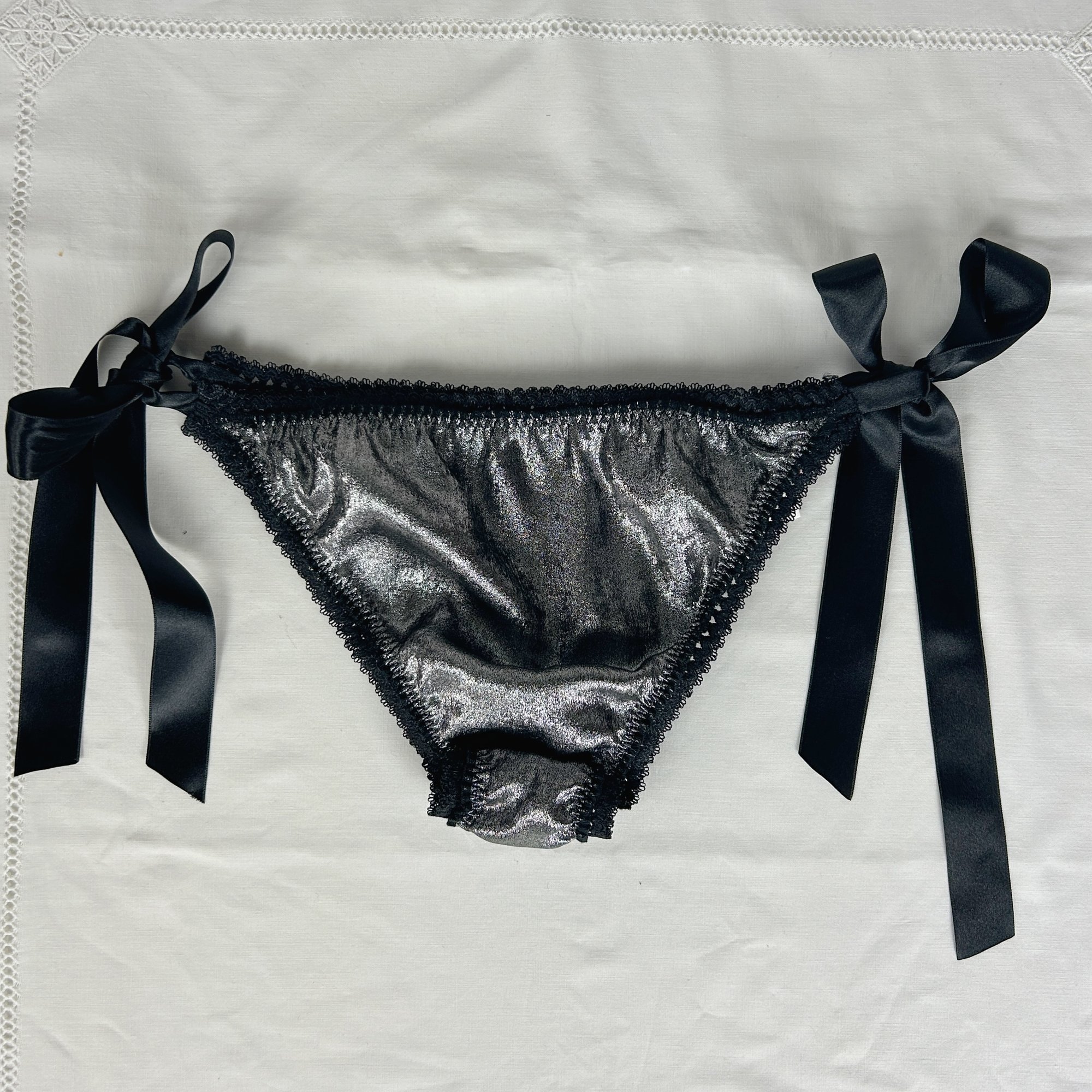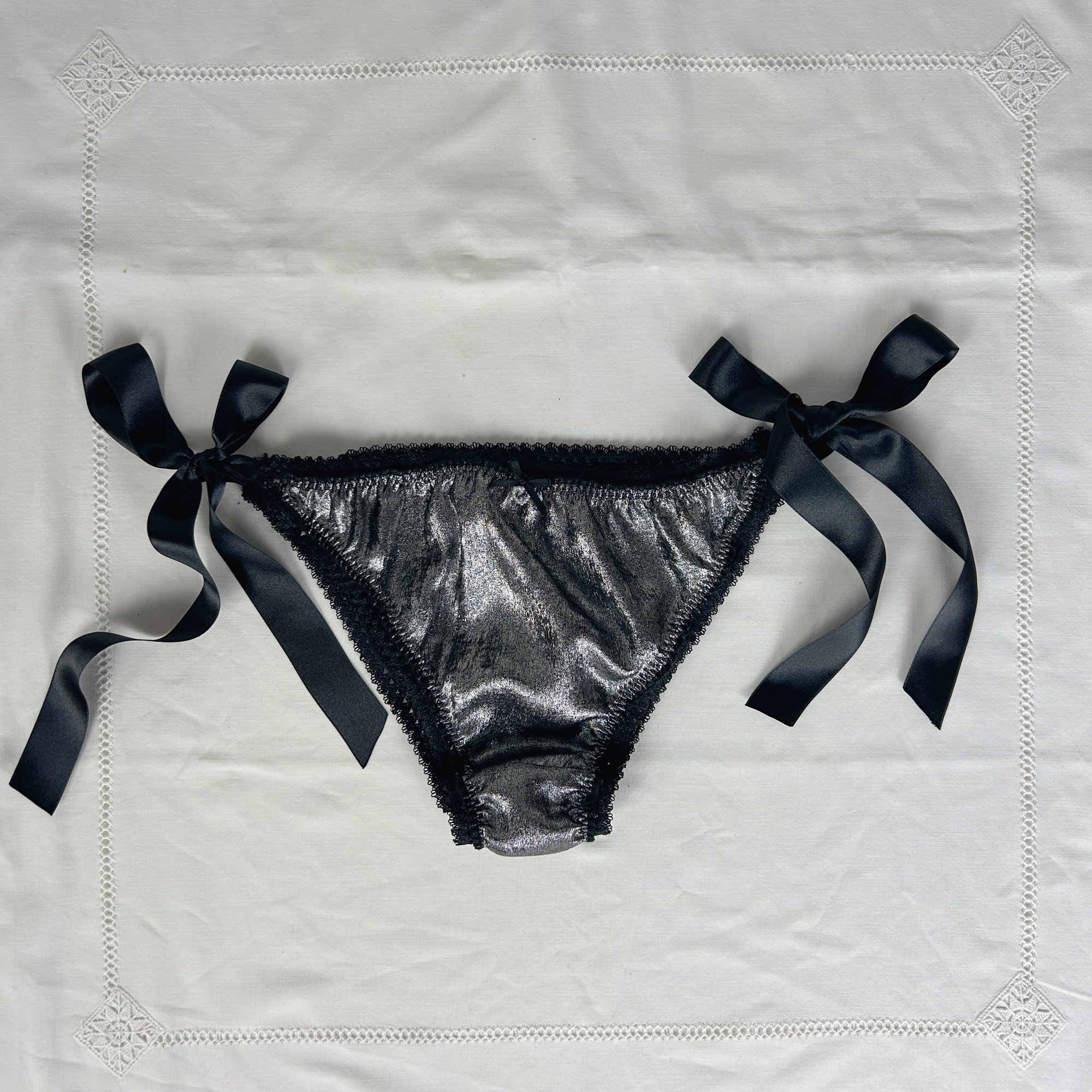 Culotte à liens satinés argentée. Cette culotte cheeky vient se fermer grâce à des rubans noirs, à faire dépasser d'un jean taille basse l'été pour agrémenter sa tenue. Elle sera également parfaite sous les robes et jupes, et deviendra un élément de séduction dans l'intimité.