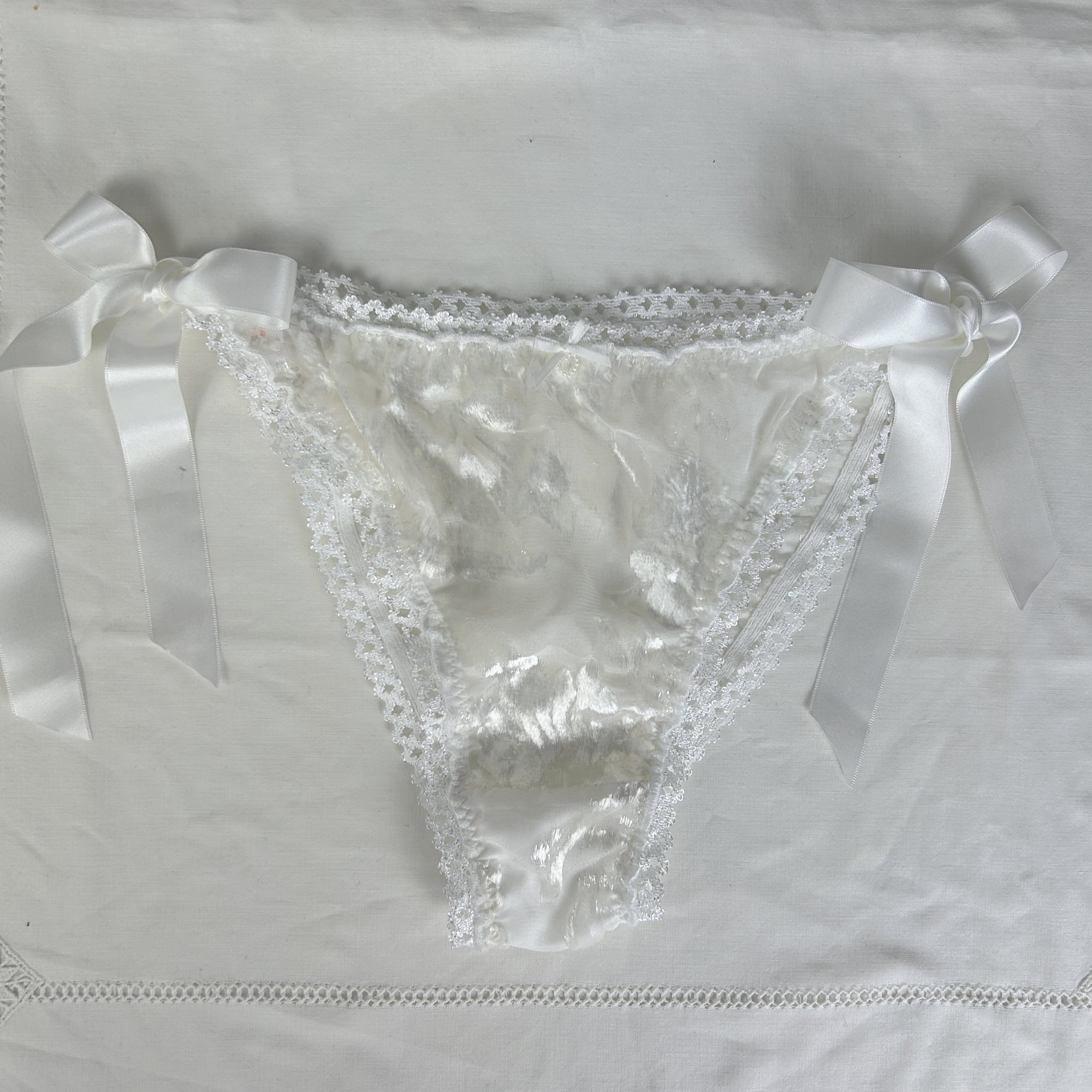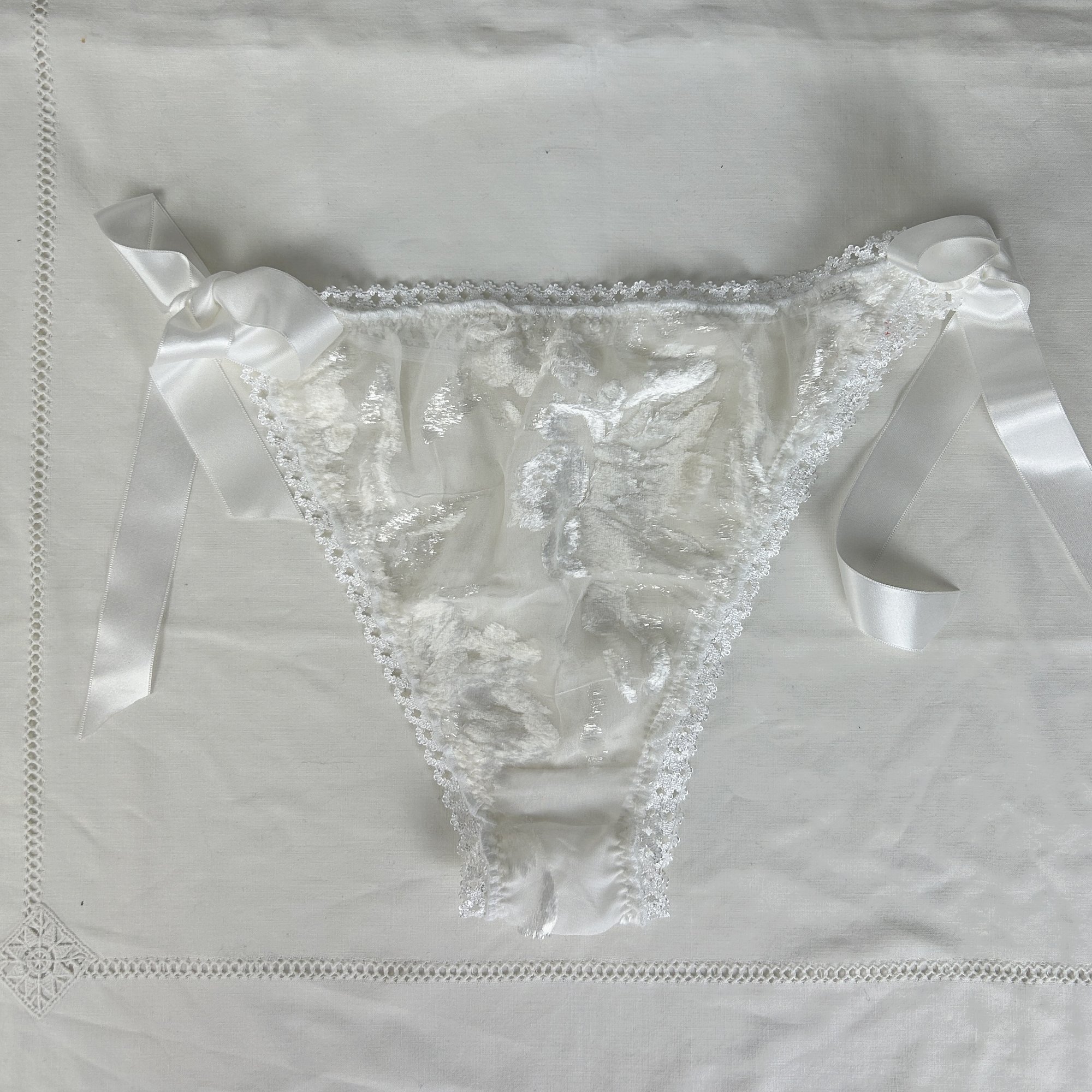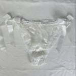 Cette culotte cheeky vient se fermer grâce à des rubans satinés, à faire dépasser d'un jean taille basse l'été pour agrémenter sa tenue. Elle sera également parfaite sous les robes et jupes, et deviendra un élément de séduction dans l'intimité.